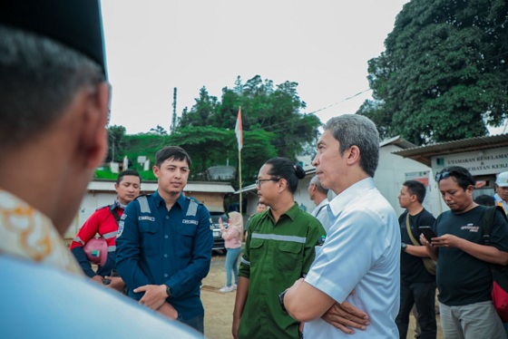 Didampingi Kepala Pelaksana Badan Penanggulangan Bencana Daerah (BPBD), Kota Bogor, Teofilo Patricio Freitas beserta pihak kontraktor dan Balai Teknik Perkeretaapian Wilayah Jawa Bagian Barat (BTP Bandung) Wilayah Bogor Sukabumi, Direktorat Jenderal Perkeretaapian (DJKA), Dedie Rachim melihat kondisi longsoran dari area proyek pembangunan perlintasan tidak sebidang Bogor - Sukabumi.